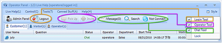 File Transfer File transfer function is added to the customer and operator/admin clients, so that the visitor and the customer support/service staff members can share documents, user manual, etc. It will benefit sales and support by making communication more effective. (Don't forget to scan the transferred file with an anti-virus application first.)  Interesting Smilies Smilies are added to the customer and operator/admin clients, which improves communication by making it more personal and more expressive. Better Login Panel In the operator/admin client, the particular login name and the associated password and so on can now be cleared one by one easily. Auto-login function is also improved, so that username and password can be saved for future login without showing the login panel any more. Remote Controller Operator/admin may remote control live chat room, by Windows Live Messenger, after easy setting. | Image transfer A picture is worth a thousand words. Image transfer function is added to the customer and operator/admin clients, so that the visitors and the operators can share pictures, screenshots with each other. Low Rating Notifer Admin will get email notification if the rating is lower than a specified level, e.g. lower than 3 points. It's effective to manage the staff team and ensure the service level.  Auto Greetings Auto-greeting message setting is added: operator may define greeting message in the operator client and make it personal.login without showing the login panel any more.  Optimized User Experience Timestamp is added to admin/operator and customer clients. New coming messages are highlighted. Chat logs sent by email are optimized in format; The online operator are made top in the admin panel; More search criterion (operator name, rating) is added when searching chat logs, and so on. | Improved Toolbar In the operator/admin panel, the buttons of the toolbar can be locked/unlocked, enabled/disabled, including operator buttons, login buttons and chat buttons.