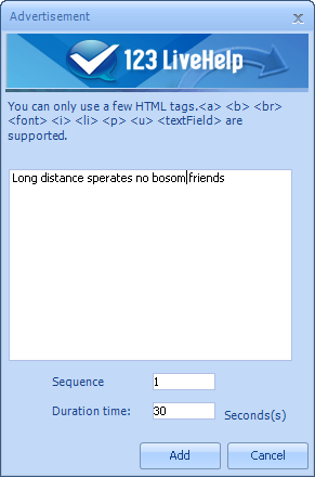 Enter your HTML code, Sequence and Duration time here and click the Add button. If you need to add an Image AD, please click Add image AD.