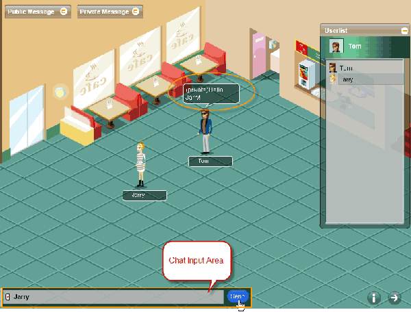 Select an avatar, fill in the required fields, select a room, click Chat, then you would be redirected to the room(let's take Cafe as an example): To walk around in the room To chat You can begin your chat by clicking the avatar or its username in the Userlist.